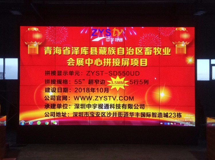 青海省澤庫縣藏族自治區畜牧業會展中心55寸超窄邊3.5mm5行5列液晶拼接屏項目,安裝調試完成并且順利驗收,中宇視通科技全體職工從深圳發來賀電!