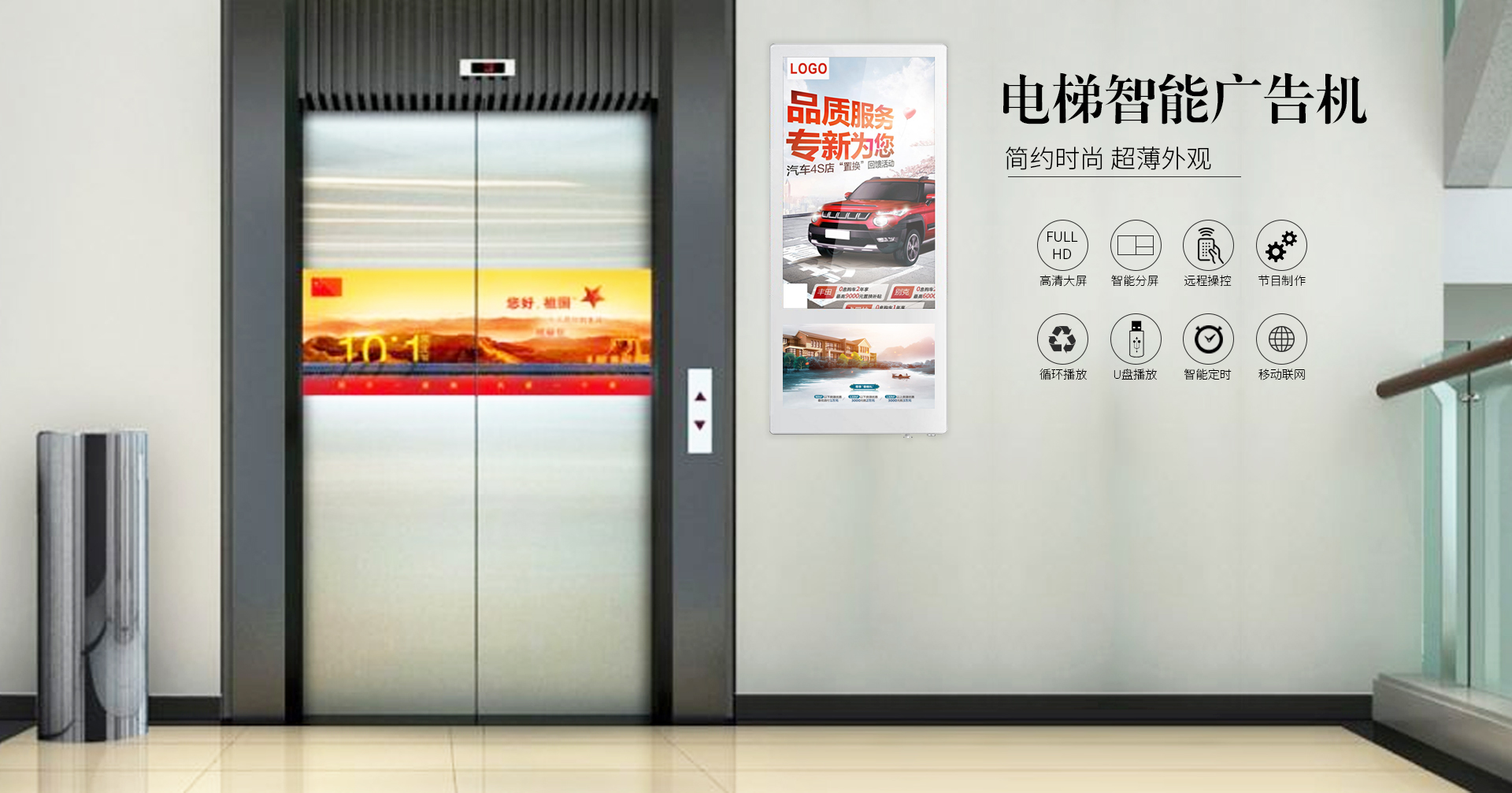 電梯困人安撫:當電梯運行出現困人故障時,電梯廣告機可在第一時間自動播放安撫視頻告知乘客電梯的當前狀態,正確的處理方法,避免因乘客的慌亂錯誤操作造成事故。