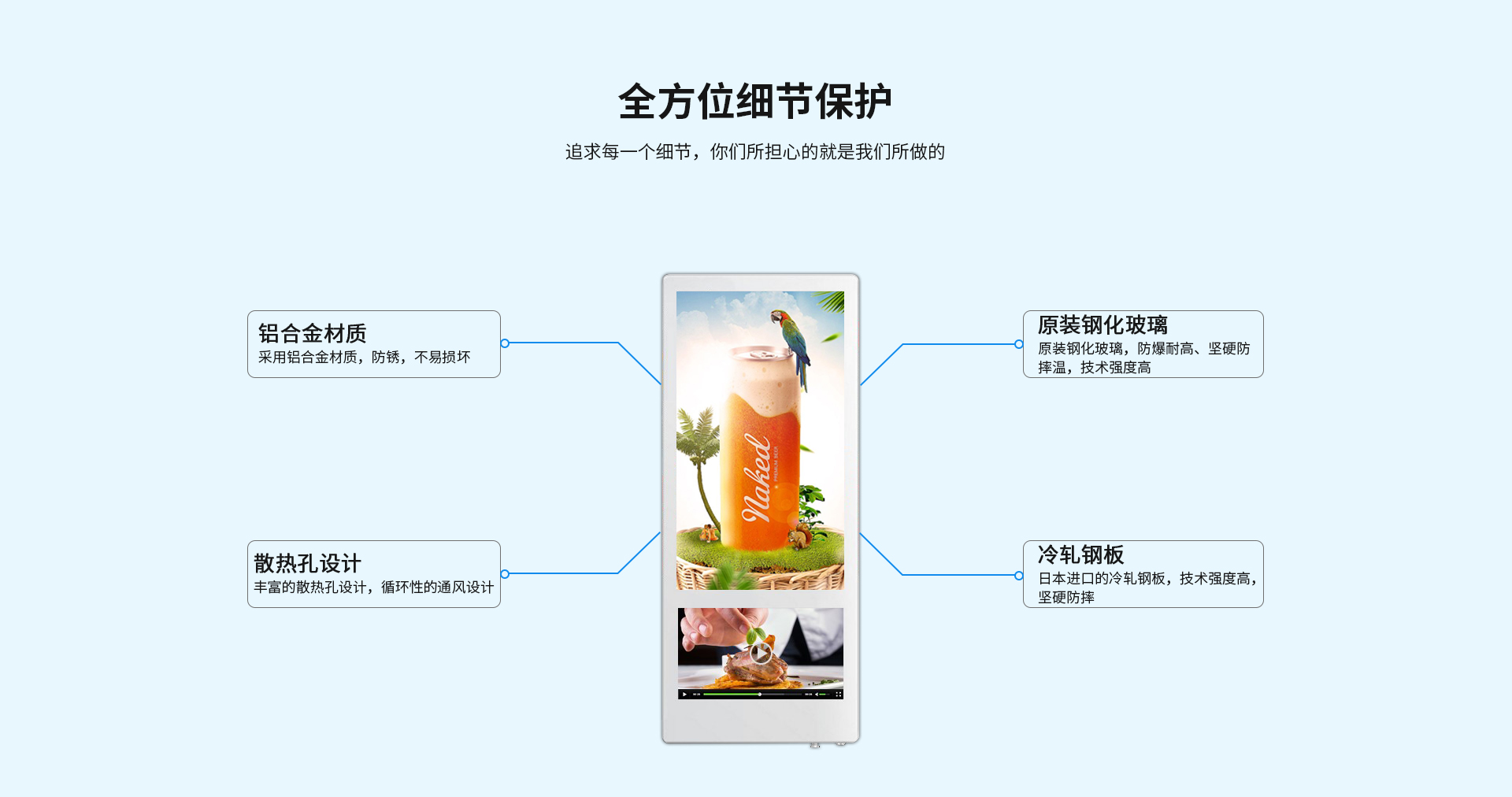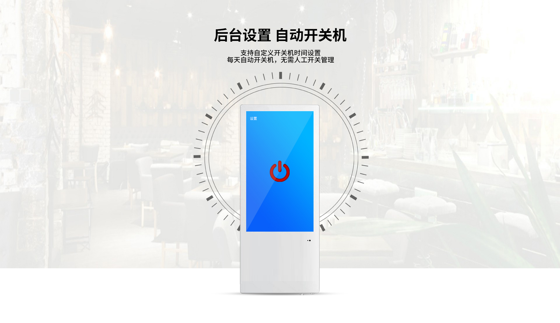 多媒體播放功能:15.6寸電梯廣告機可以實現數字化多媒體播放,可以播放音頻、視頻、圖片、文檔等一系列媒體文件。支持主流的(MP3,APE,FLAC,AAC,OGG)等音頻格式。同時支持多種格式(MKV,MPEG4,AVI,FLV,MOV,RMVB,WMA)視頻播放,還支持各種圖片文檔類(JPEG, BMP, PNG,GIF )的廣告播放功能。